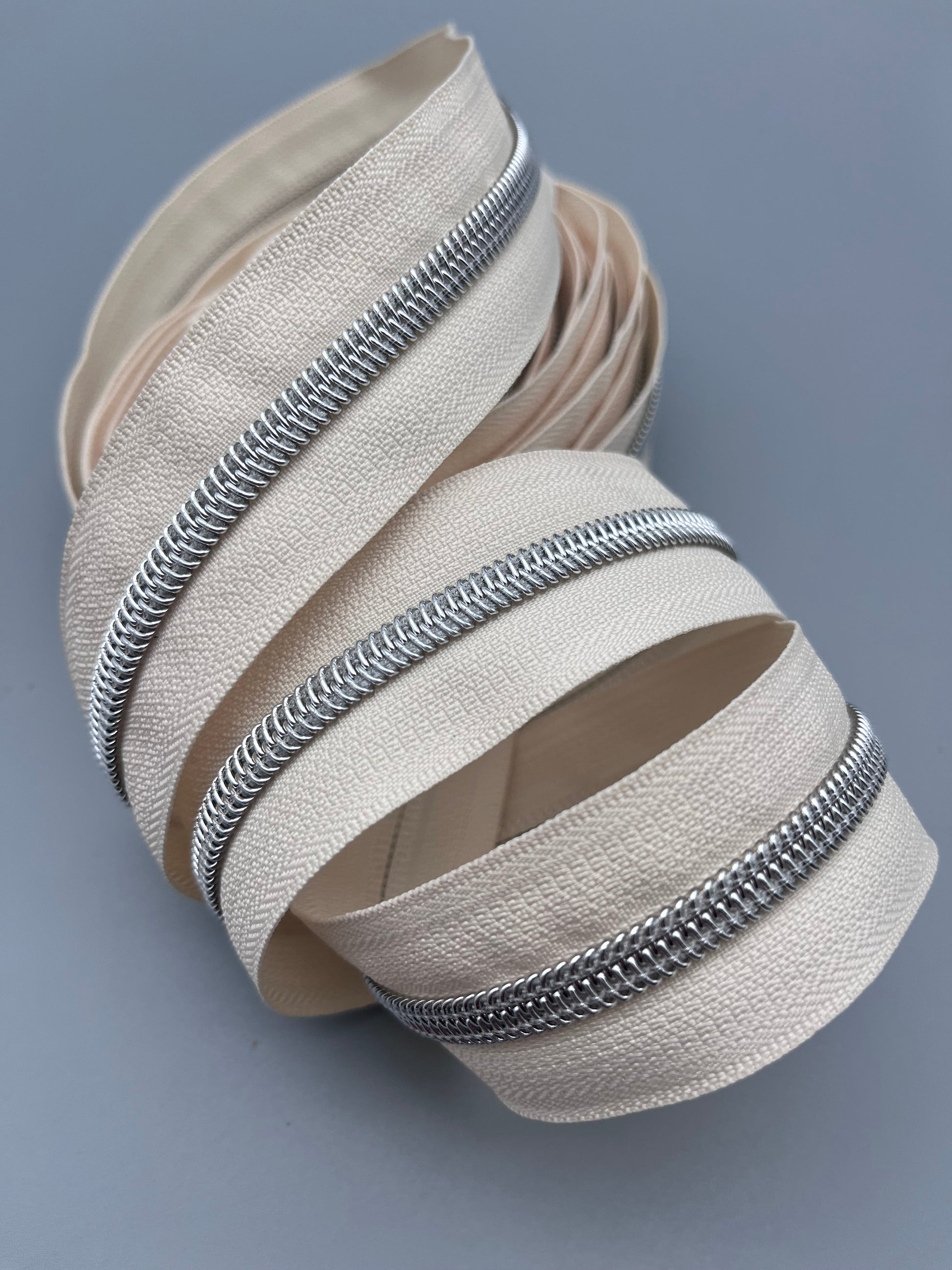 This zipper tape gives you the look of metal with the ease of nylon! The nylon coil has a beautiful metallic shine — perfect for adding a professional touch without the bulk or stiffness of real metal teeth.