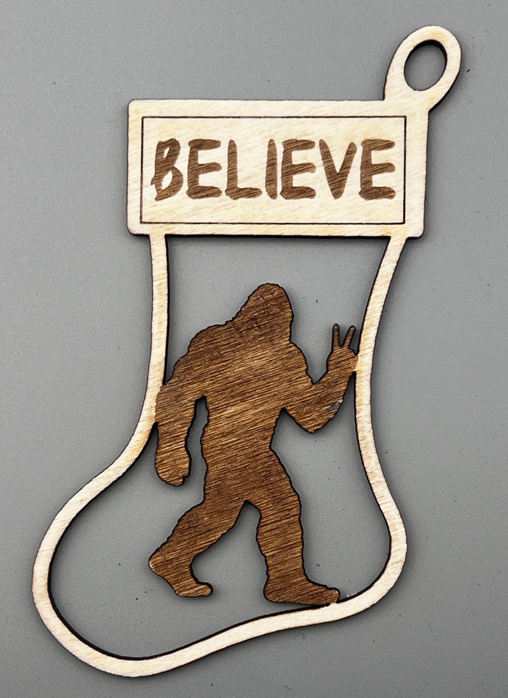 Add a touch of mystery and fun to your holiday décor with this laser-cut wooden ornament! Shaped like a Christmas stocking, it features a detailed cutout of Bigfoot flashing a peace sign, tree and moon or just his foot, with the word “BELIEVE” engraved across the top.