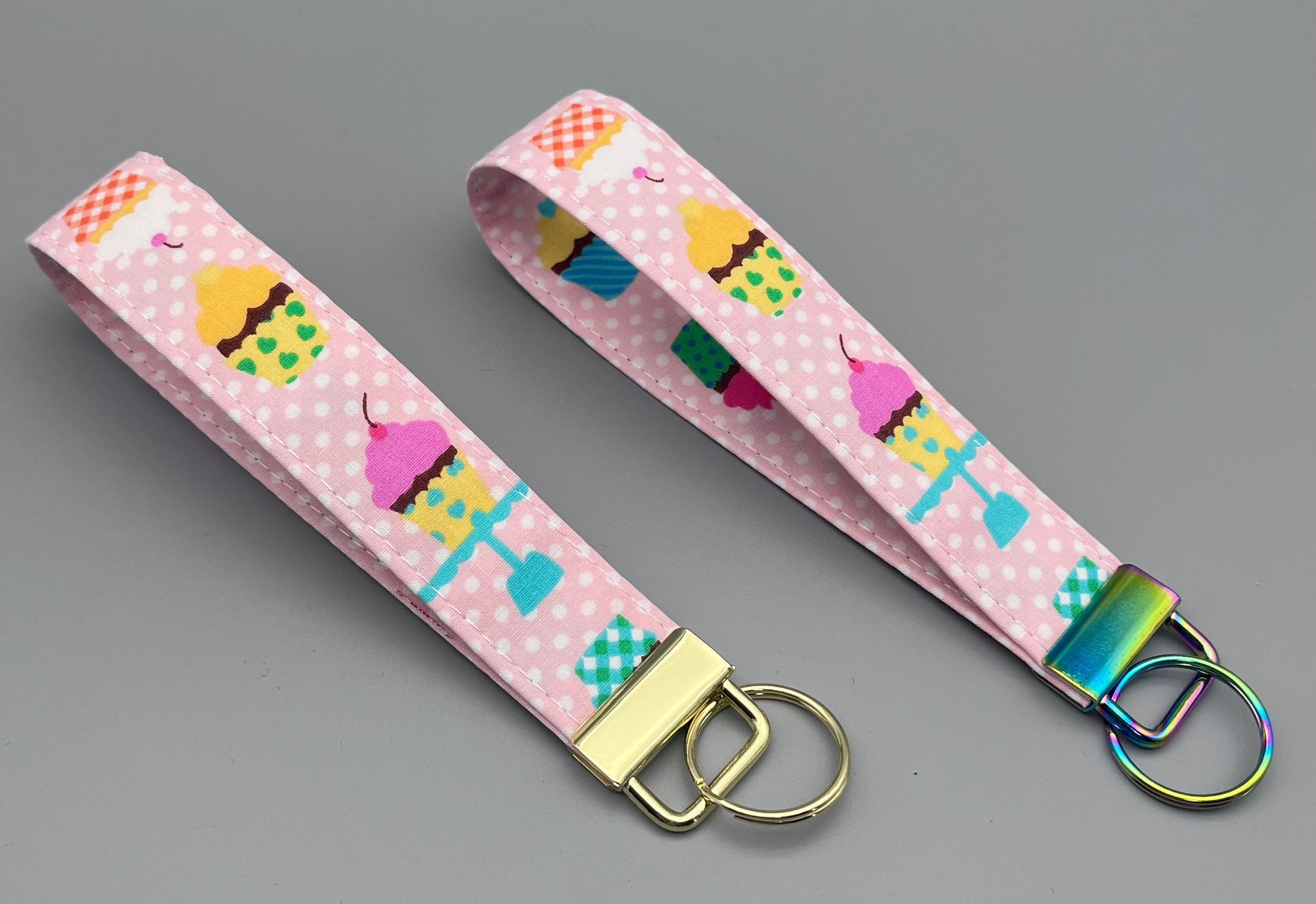 These handmade fabric wristlet keychains are both stylish and functional. Made with a soft pink fabric featuring a fun cup cake and polka dot pattern, they add a playful touch to your everyday essentials. Each wristlet is finished with sturdy metal hardware—one in classic gold and the other in a rainbow finish—making them durable and easy to attach to keys, bags, or lanyards. Perfect for keeping your keys handy while adding a pop of personality to your accessories.