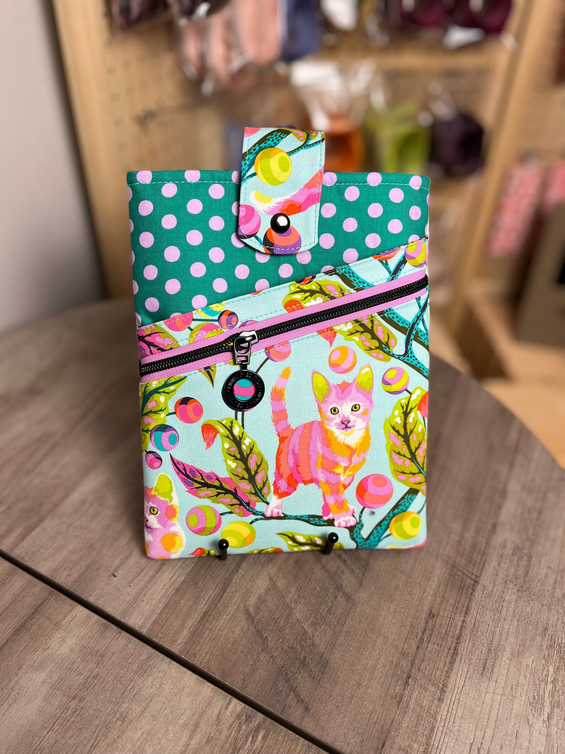 Disco Kitty Book Sleeve with Green and Purple Polka Dots