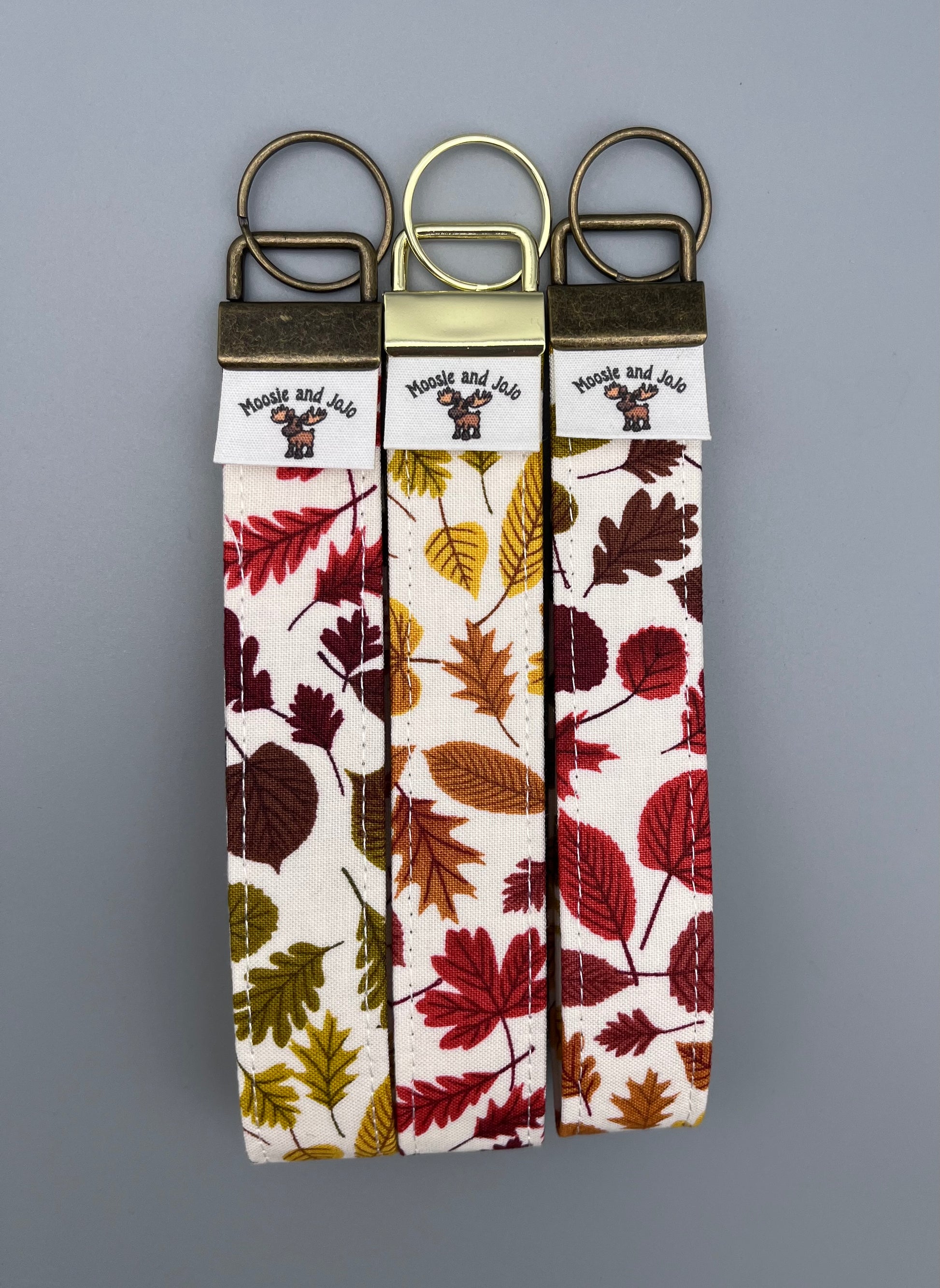 Handmade fabric key fob wristlets with a festive autumn leaf design. Each wristlet features a cream background with colorful fall leaves in shades of red, orange, yellow, green, and brown. The sturdy metal hardware comes in antique brass or shiny gold finishes, with a split key ring attached for holding keys.