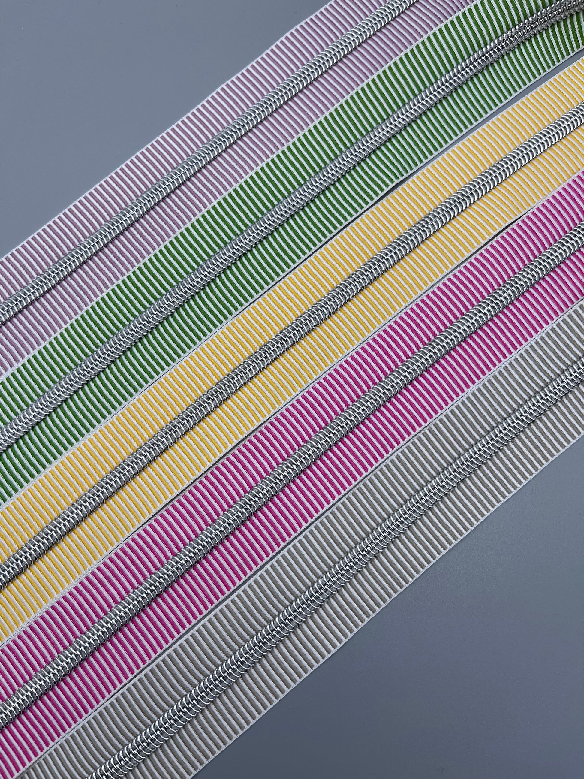 This #5 nylon zipper tape is sold by the yard and features a stylish yellow and white striped tape with a silver nylon coil. It’s the perfect mix of fun and functional — ideal for custom bag making, pouches, and sewing projects where you want your zippers to stand out!