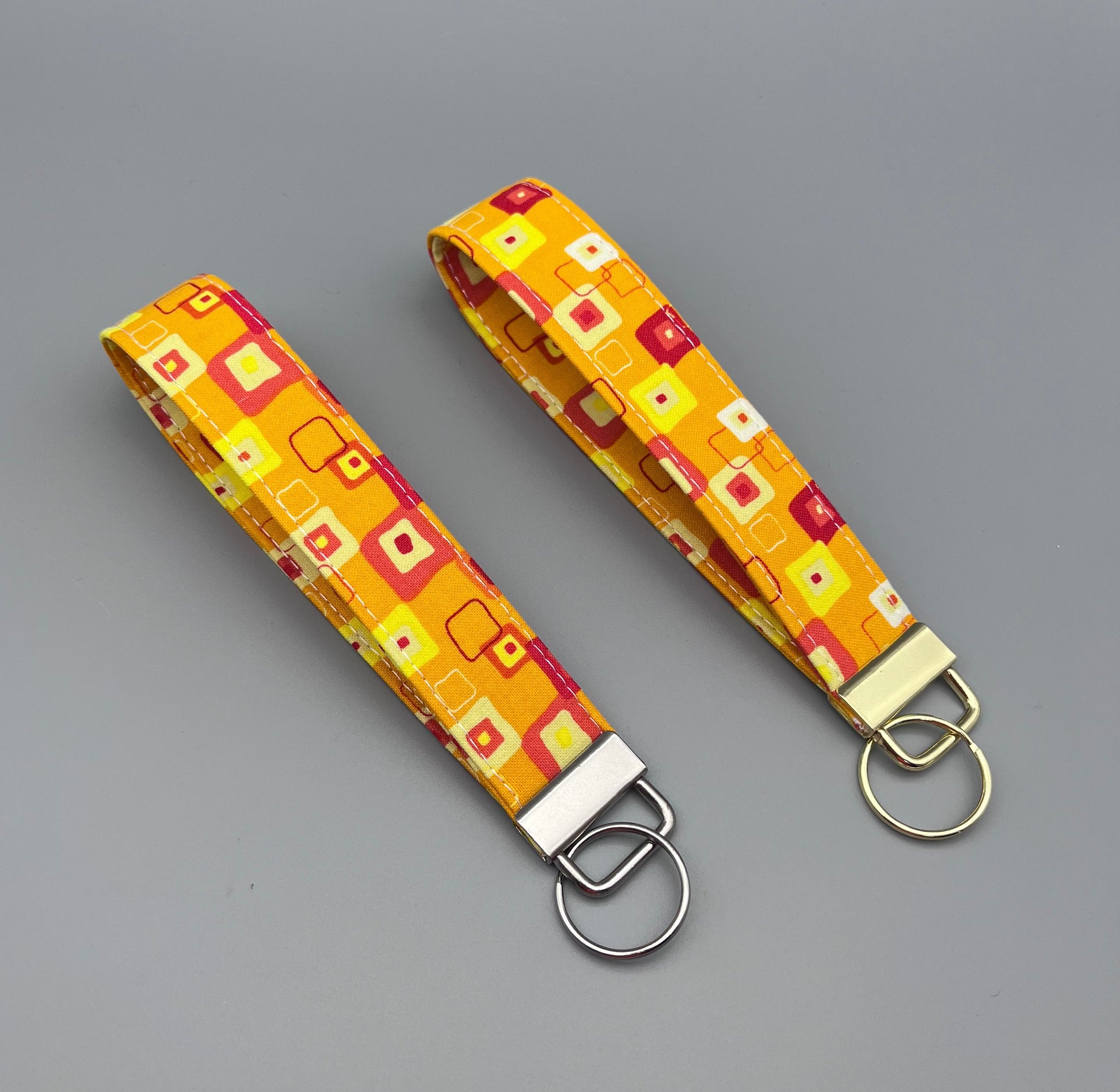 Bright and stylish handmade fabric key fob wristlets, perfect for keeping your keys close at hand. Made with durable cotton fabric in a vibrant retro square pattern of orange, yellow, and red, these wristlets add a fun pop of color to your everyday essentials. Each features sturdy metal hardware with a key ring, making them both practical and fashionable. Great for gifts, stocking stuffers, or personal use!